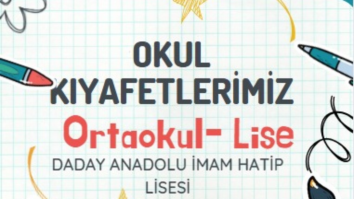 Ayrıca geçen seneki okul kıyafetleri 10,11 ve 12. sınıflar için 2024-2025 Eğitim öğretim yılında belirlenen kıyafetler aynen devam edecek olup (logolu) 3 yıl devam edecektir.9.sınıftan başlayanlara yeni okul kıyafeti 10-11 ve 12. sınıf öğrencilerine eski okul kıyafetleri zorunludur.Okul Kıyafeti ile okula gelmeyen öğrencilere ortaöğretim kurumları disiplin yönetmeliğinin ilgili hükümleri uygulanacaktır.Okul arması okul müdürlüğümüzce verilecektir.